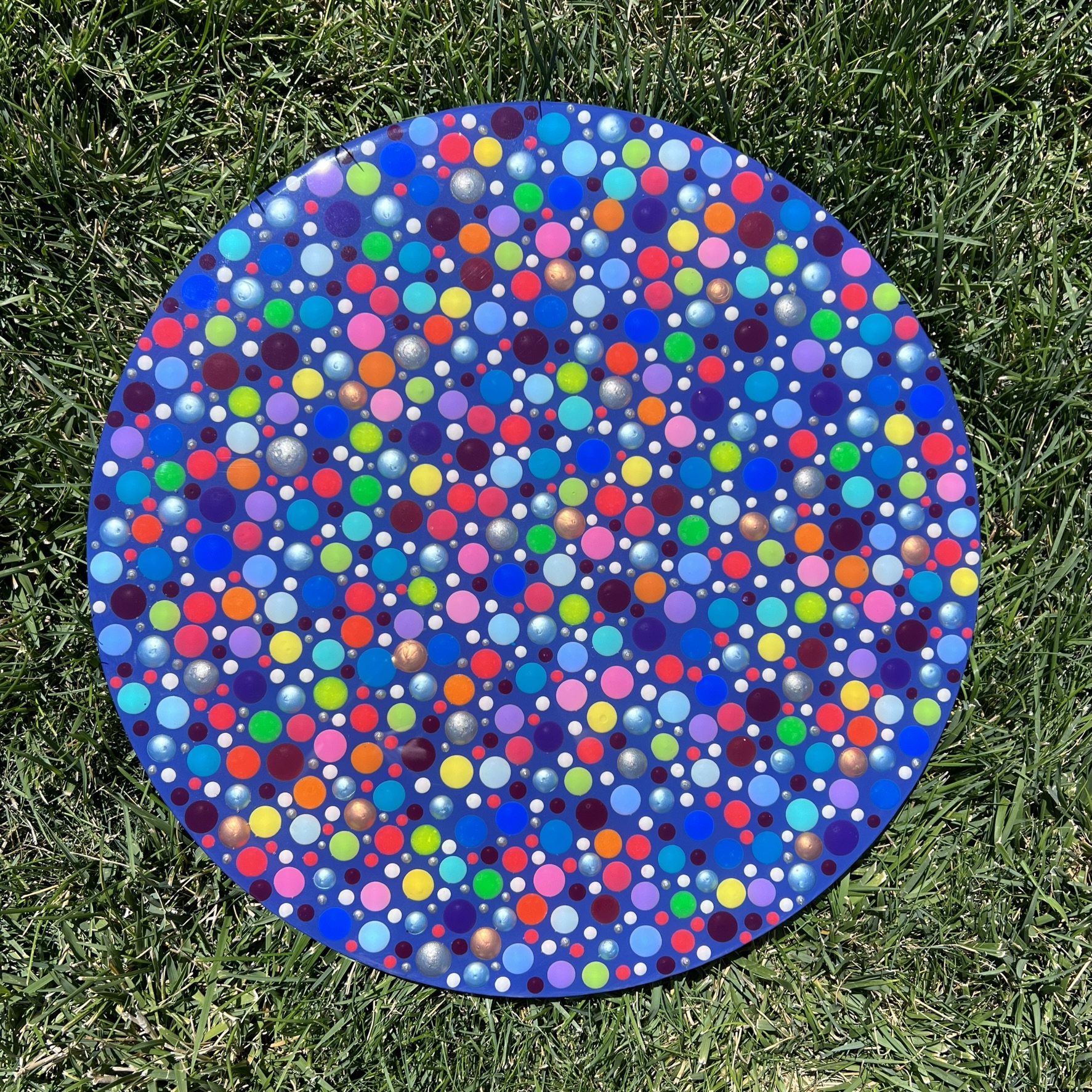 18″ Round navy blue canvas painted mega dots in every color I had on hand. Two coats of resin was applied. Could be used as a table or wall art.